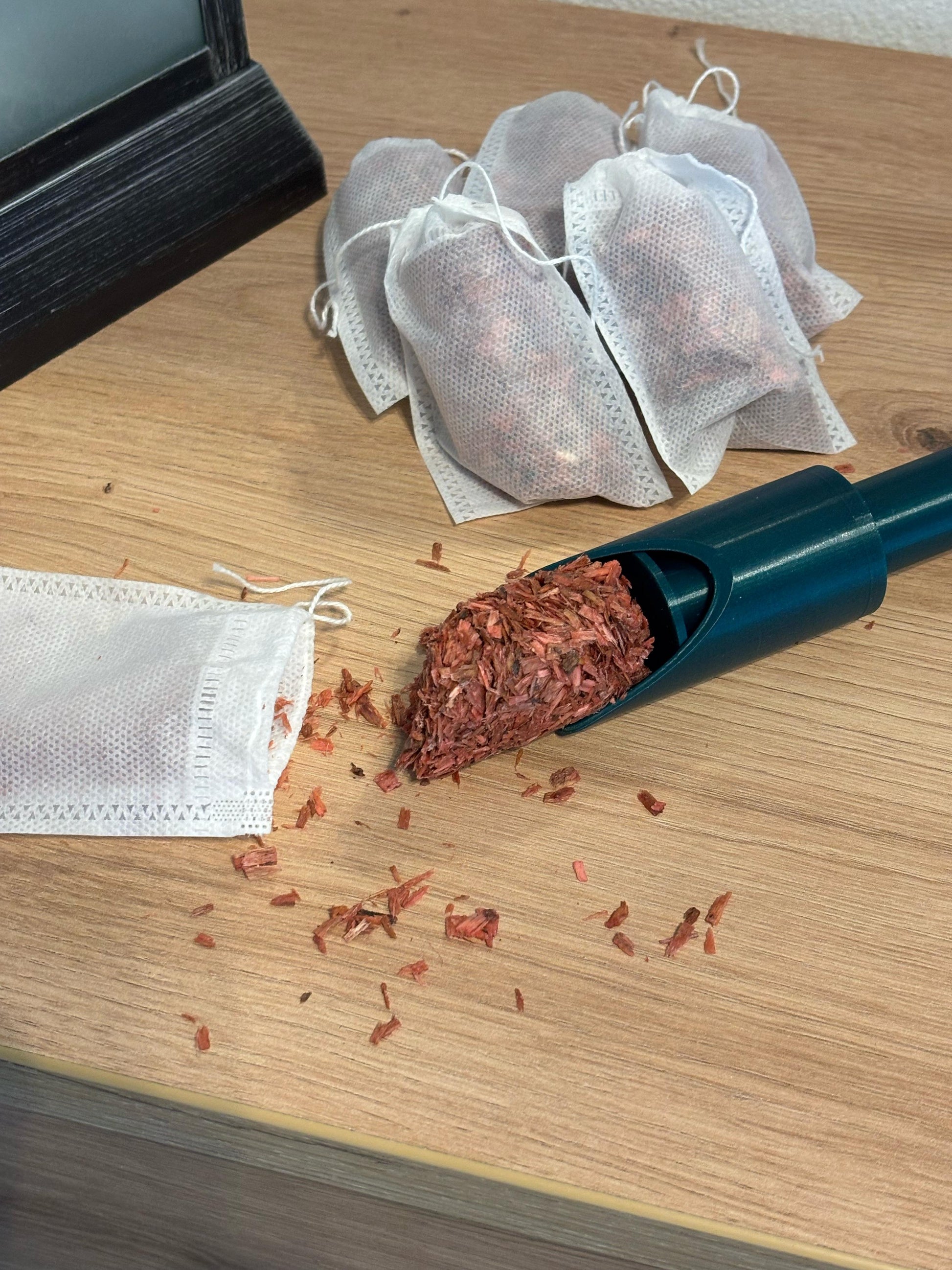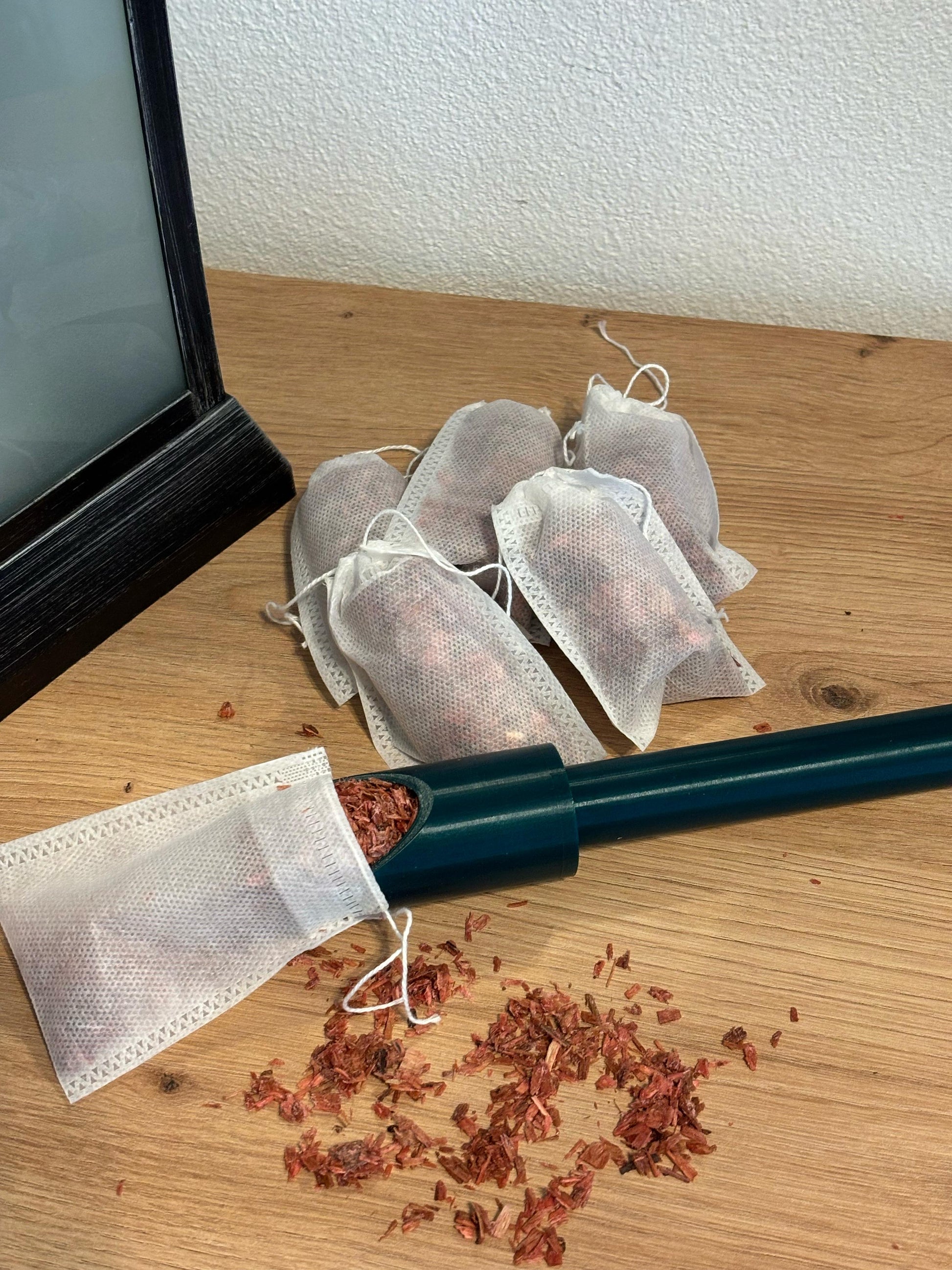 Die geniale Schaufel zum Befüllen der Teebeutel mit den Sägespähnen.